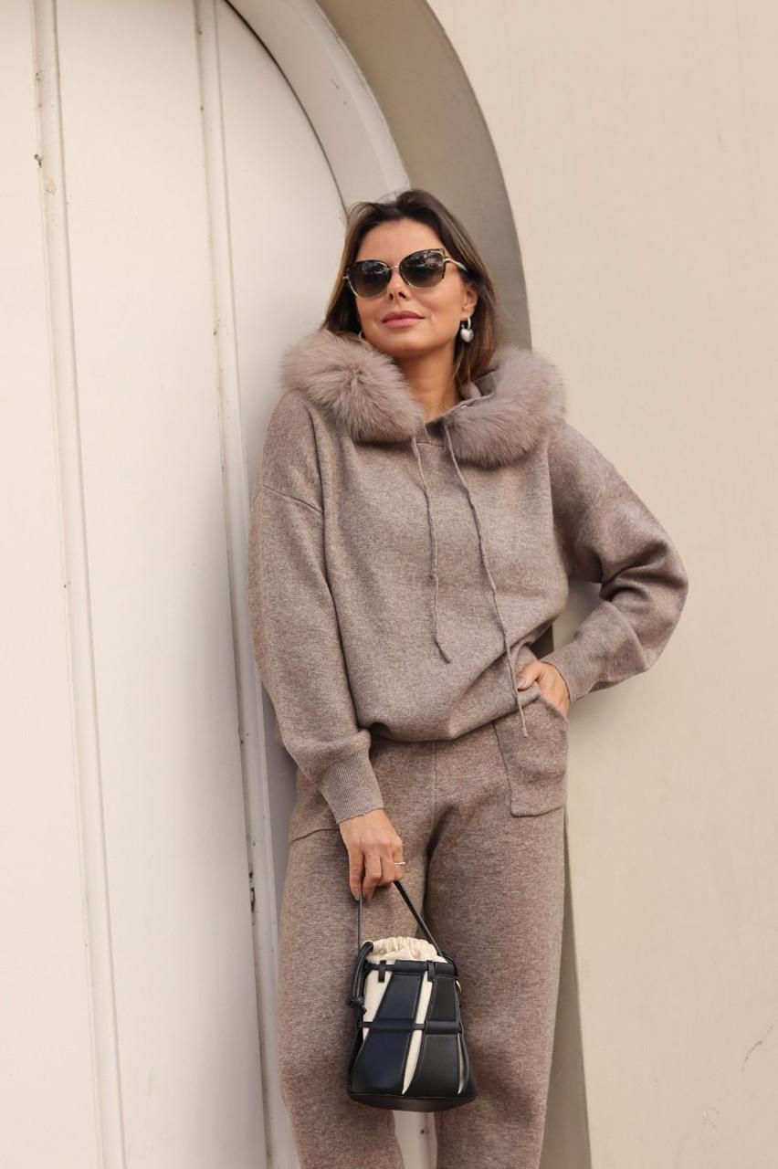 O luxo que se sente no corpo. Este conjunto em lã pura traduz a sofisticação do conforto absoluto, unindo textura nobre, caimento impecável e um design pensado para o cotidiano elegante.