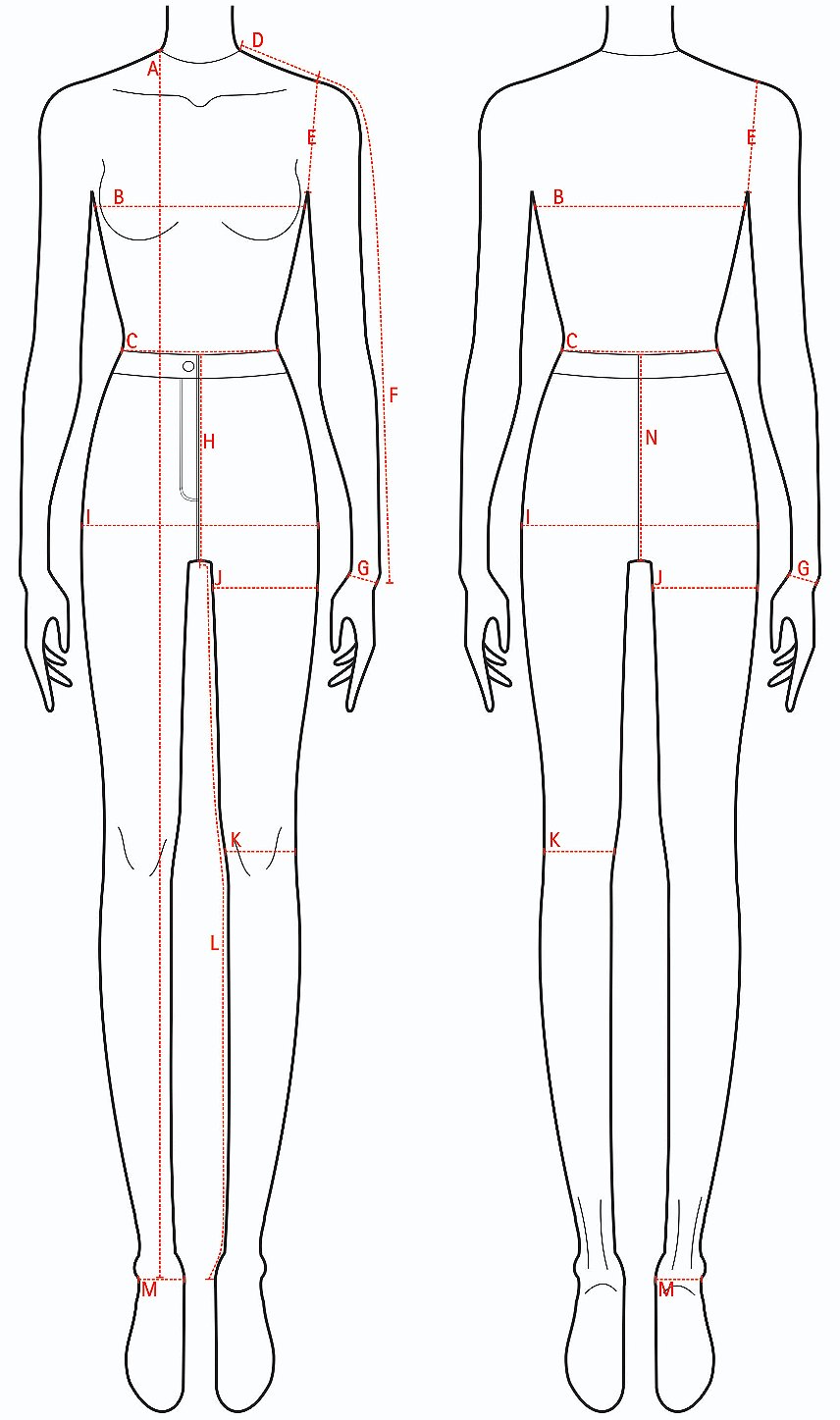 Para saber com precisão suas medidas, siga a legenda e a ilustração abaixo, utilizando a fita métrica como guia das linhas em vermelho.