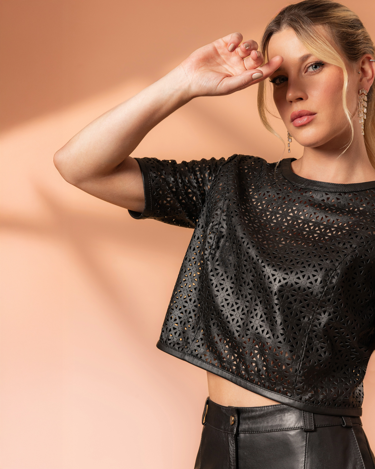 T-shirt de couro perfurada cropped, com zíper atrás.